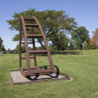 Description: William Tucker's Turning takes the form of a three-sided ladder. It is sitting still, but has the potential to rotate without end. It is part of a series of sculptures created by Tucker in the late 1970s and early 1908s to explore a central negative space encased within a geometric frame. For this piece, that frame began with the shape of a curved triangle. Then two such triangles were joined by a series of bars, providing stability and evoking the form of a ladder. Tucker, a British-American sculptor and art scholar, was a resident at Sculpture Space in 1981. During that time, artists Lee Tribe and Paul Hopmeier assisted Tucker to create this form out of weathered steel.