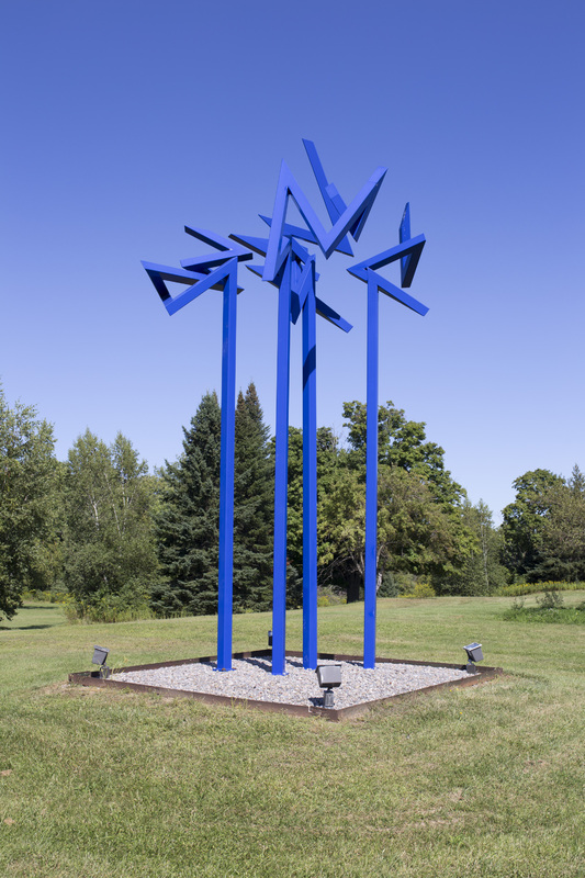Description: As the pieces of Crown join together mid-air with the sky in the background, they appear as one cloud, or flower, or crown . . . it's open to your interpretation. It may reference shapes from nature, but the brilliant blue shade is a reminder that it is man-made. Though made of five separate pieces of ultramarine blue square tube, it gives the viewer the impression of being joined together as one. Artist Rainer Maria Wehner based the structure of Crown on 'Sütterlin,' an old style of German handwriting. The acute angles of these zig zag forms bring this style to a third dimension. This work evokes his interest in the structures of writing and of human bodies as seen through an x-ray.
