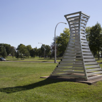 Description: From the Griffiss Sculpture Park website: "In its construction, Chimney combines two worlds: the world of business and industry and the world of creativity. Straight lines, edges, and right angles have been softened in a gently undulating curved design. Moreover, the sculpture has two entirely different visages: one belonging to day, and the other to the night. During the day, the light of the sun reflects off the polished aluminum to produce a brilliant glare, and at night the amber lamp inside that casts its glow in the dark produces a very different effect. The artist hopes he has captured the spirit of collaboration between business and art that the Griffiss Business Park project embodies. Domanski feels that by providing an opportunity for the presentation of contemporary art, Griffiss Business Park is itself a beacon. It is a model of the mutual benefits that industry and the arts can realize in their coexistence."