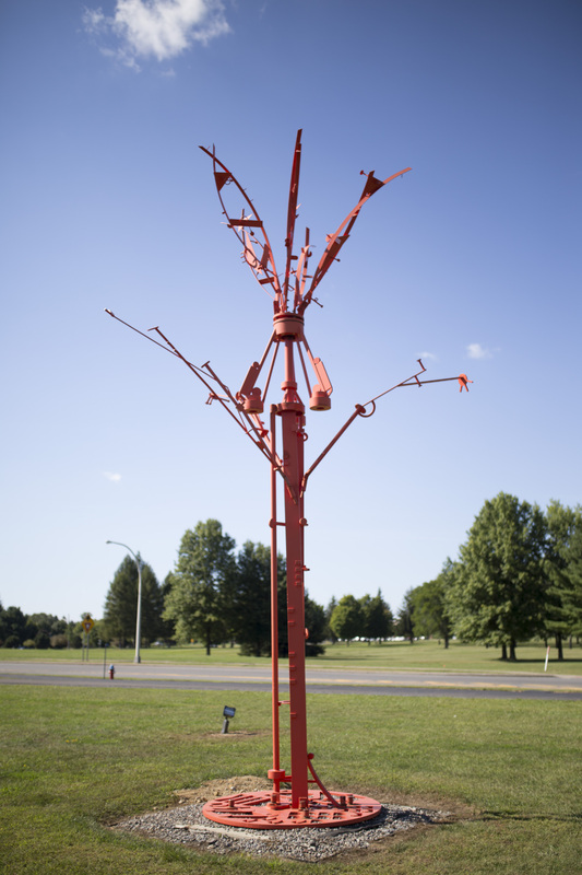 Description: This work by artist Tash Taskale was installed at Griffiss International Sculpture Garden in 2008. About this work, Taskale says, “I am interested in the archeology of objects that are all around us. My work aims to probe the origin of things by presenting oppositions including archaic / futuristic, primitive / industrial, and ancient / modern. I present such contradictions to create ambiguities, which I believe can force us to be more analytical and questioning of our world. Wishing Tree represents the archaeology of beliefs from which human creates an icon and expect good fortune and protection. Uncommon forms on the Wishing Tree symbolizes people’s wishes.”