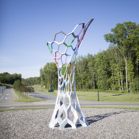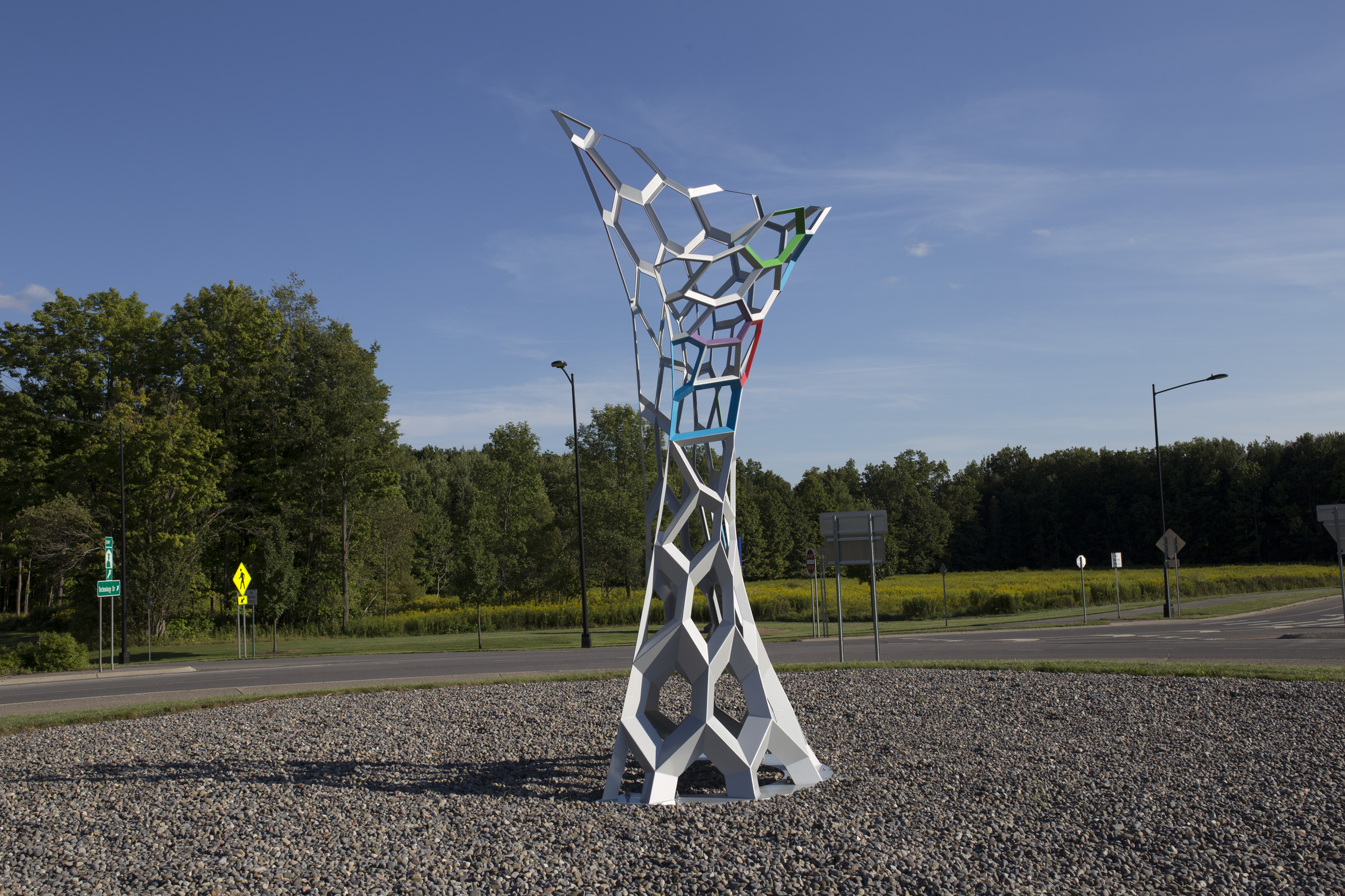 Description: Artist Osman Akan was fascinated by the hexagonal forms of carbon nano structures that cannot be seen by the naked eye. For his sculpture Nano these forms are enlarged to a scale that commands our attention. The work explores the science and the ability of manipulation possible at nano-scale. Versions of the hexagonal shapes join together, shifting and scaling as the piece gets taller. As the sculpture rises from the ground, an interplay between the convex and concave appears. Commissioned in 2013 by Sculpture Space, this sculpture was funded by Mohawk Valley EDGE. It was installed in 2014 facing the main entrance at the new Nanocenter at the SUNY Institute of Technology in Marcy. Characteristic to his mode of working, Akan modeled the artwork in 3D software. For the full scale form, thin carbon steel sheets were carefully calculated, laser cut, and welded so that the angles within each cell give the form strength and load bearing capacity. Metallic paint reflects the changing light in the environment, adding to the sense of a shifting form. In fact, the professional coatings used in painting the sculpture are manufactured to include nanoparticles. Walking around the sculpture, each separate view is a different perspective of light, form, and the surrounding environment.