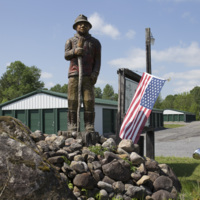 Description: Walking stick in hand, his pack on his back, a hiker stands ready to head into the Adirondacks. He stands by the sign for Pete's Storage in Remsen, near the border of the Adirondack Park. His rugged nature evokes memories of the origins of the Remsen area, and the pioneers who began to settle the land in the late 1790's. This wood carving defies placement in a particular era or season. With tall, heavy boots on his feet, he's prepared for all the dramatic seasonal changes of the area. Whether he's a pioneer from history heading into an uncharted forest or a weekend hiker exploring in his leisure, he's ready to face whatever nature has to offer him.