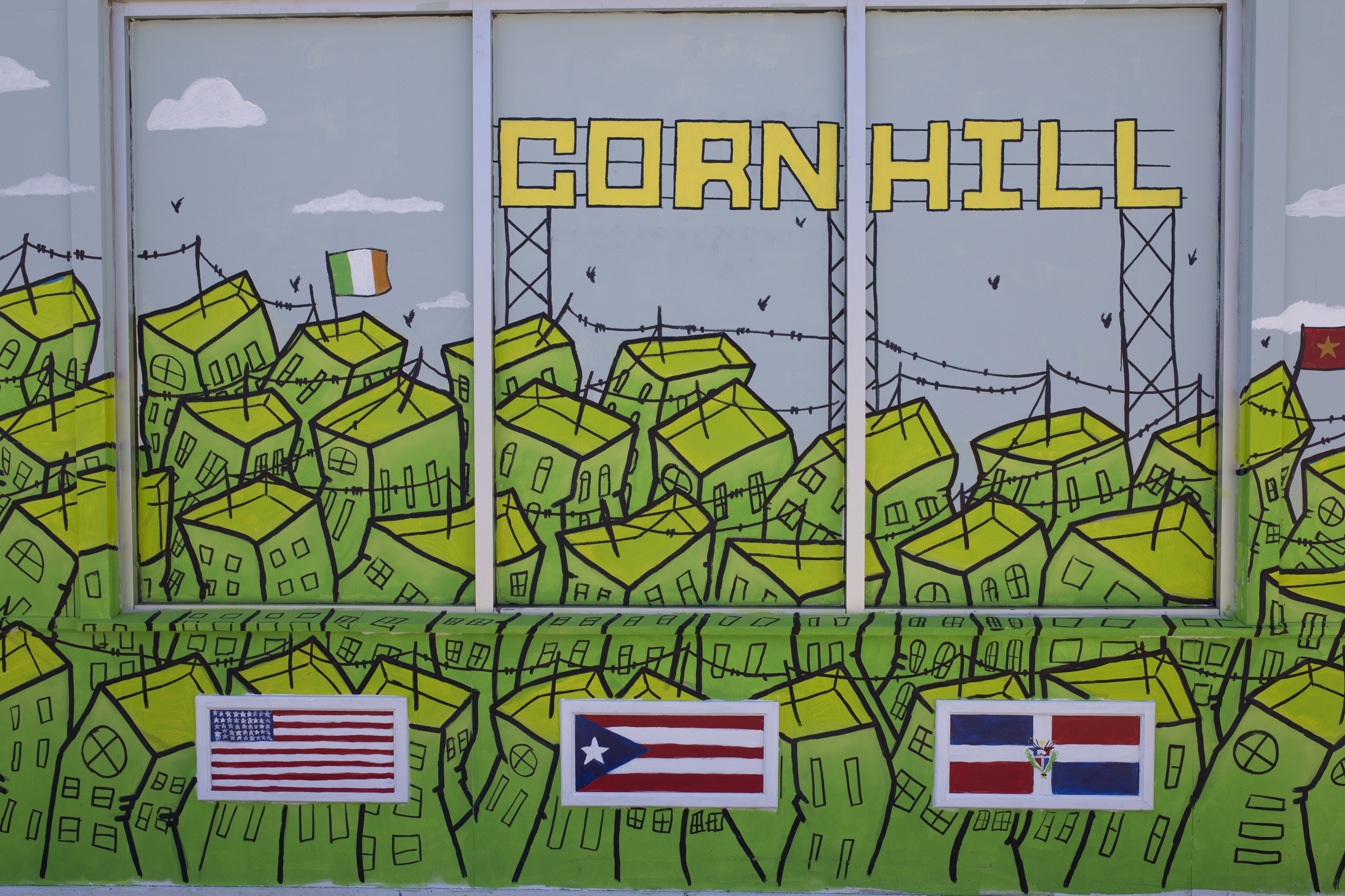 Flags fly across this stylized cityscape to celebrate the ethnic diversity of the Cornhill neighborhood. For this mural, artists Tony Thompson and Tino Lopez found nuanced ways to incorporate ideas from community members. The green buildings are reminiscent of the corn fields that filled this area years ago. They show how this urban setting has sprouted from its rural history. Telephone wires spread between buildings as a metaphor for important connections among community members. A smiling sun embodies the idea of empowerment, sending rays across the rest of the landscape and helping a flower blossom to thrive.