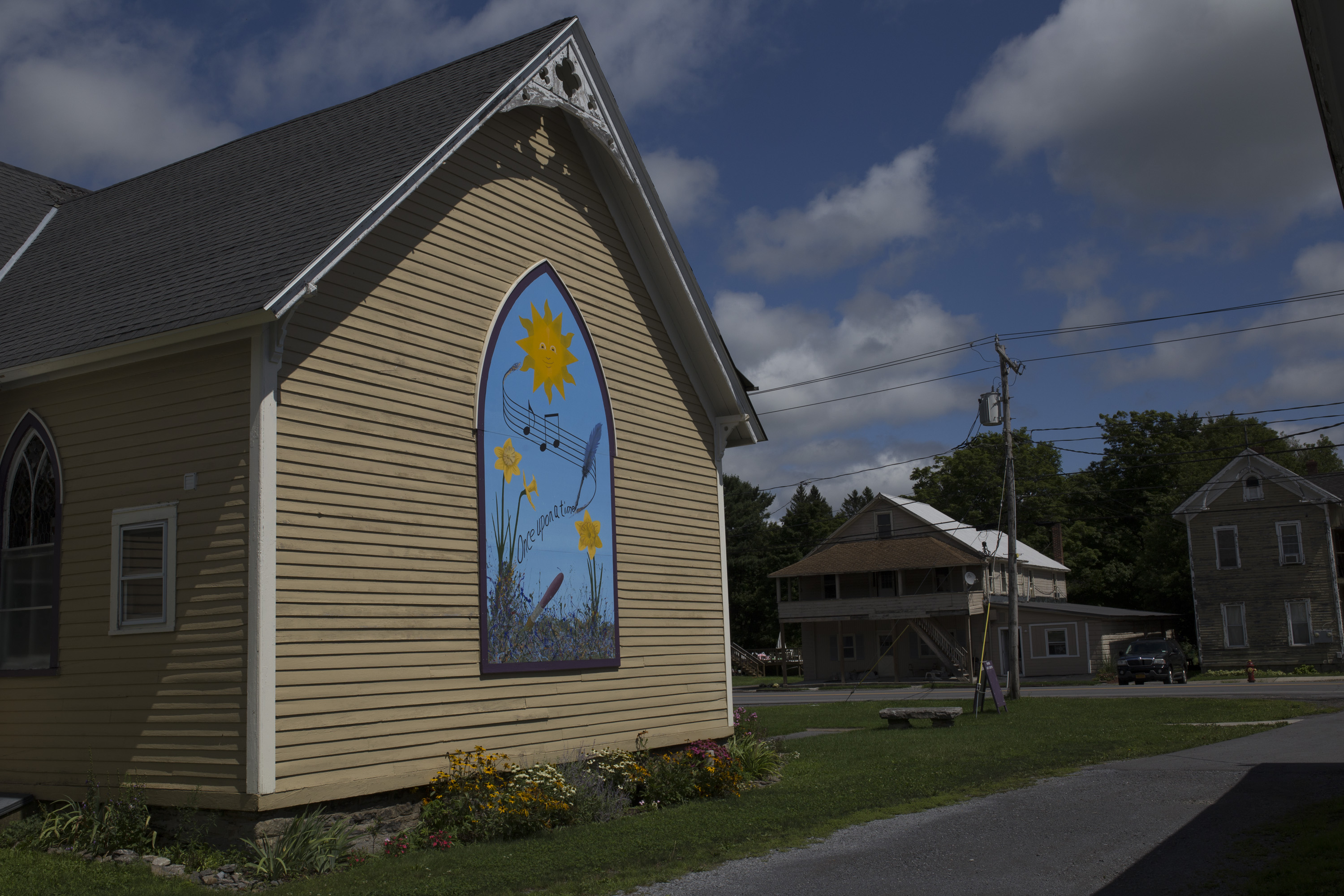 What can you do with a damaged window? Cover it with a work of art! In 2010, the Remsen Performing and Visual Arts Center found its home in a historic church that was built in 1893. One of the building's two large stained glass windows was heavily damaged, so it was covered with wooden panels. A few years later the Center began to raise funds to cover them with a mural. A Community Arts Grant from NY State made it possible for the center to commission artist Peter Rashford, of Midair Studio in Cold Brook, NY.