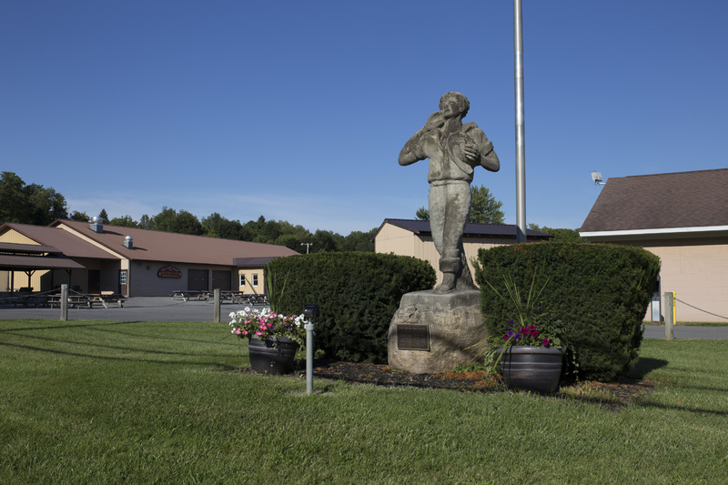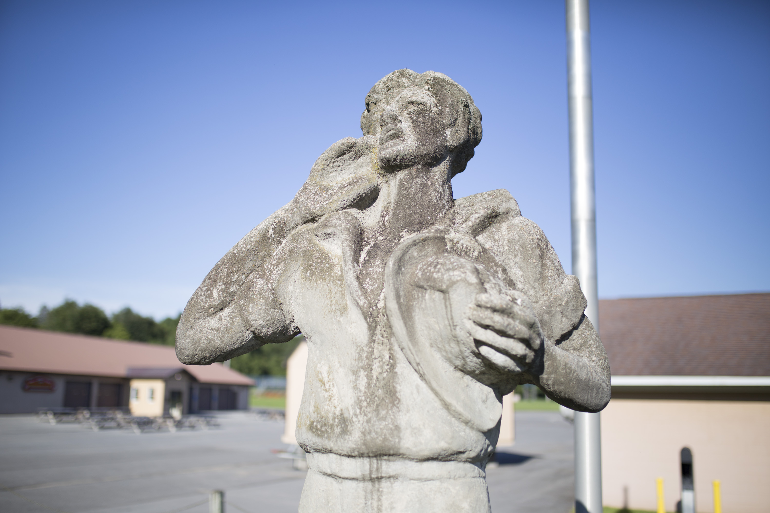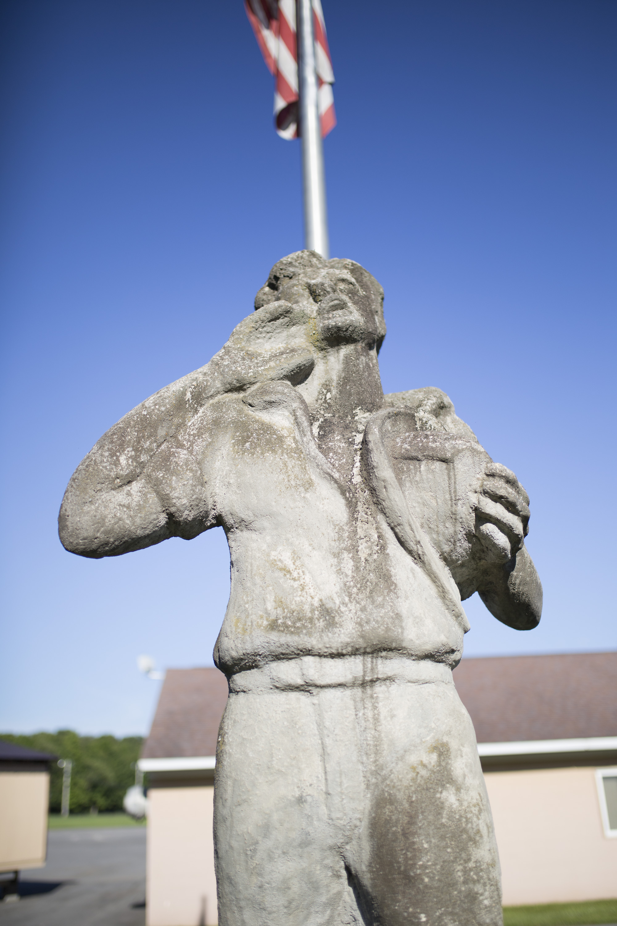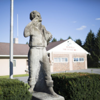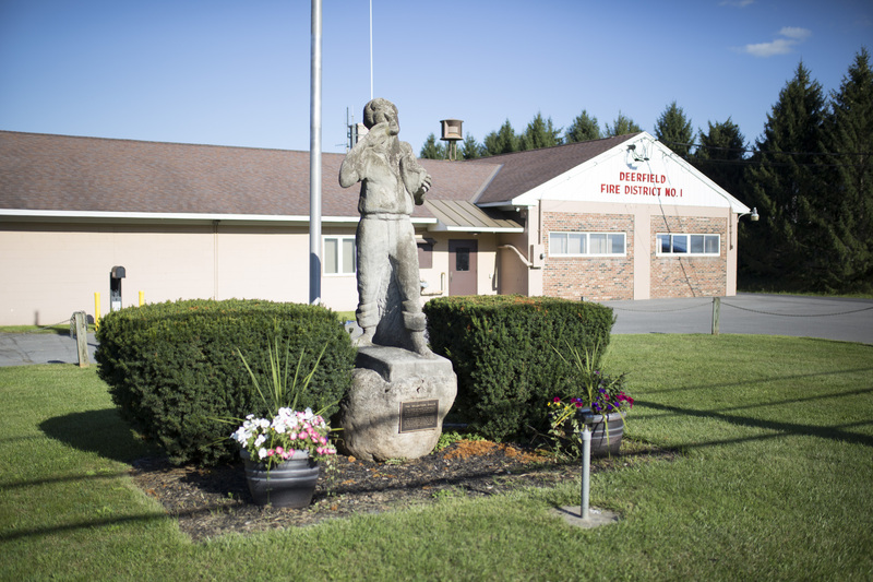 Description: Larger-than-life, standing tall and strong, a volunteer fireman calls out to his fellow firefighters. Standing in front of the Deerfield Fire Department, this work honors volunteer firefighters everywhere. Utica sculptor Henry Dispirito worked on this piece through the summer of 1970. As Artist-in-Residence at Utica College, he frequently asked students and faculty to model for him. This allowed him both to exercise and to demonstrate his approaches to capturing the humanity of his subjects. For The Volunteer Calls, however, he worked at his home studio. He asked his next-door neighbor, Bob Coletti, and his nephew, Ben Farda, to model for the sculpture, capturing their height and strength. The fireman's form relates the urgency of his step forward as he calls out, an expression of anguish on his face. While DiSpirito usually carved directly in stone, his vision for the scale of this piece exceeded the stone he had available. Instead, he created a full-scale clay model, working on a ladder in his backyard. Then he made plaster casts in sections and poured cement. The sections were combined, and this medium of cast cement allowed DiSpirito to carve directly to unite and refine the final sculpture. It was unveiled to the Town of Deerfield in the fall of 1970.