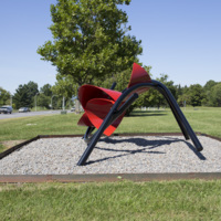 Description: The right tool makes all the difference, as seen in the rolled steel and curved pipe of John von Bergen's Peels. In the early days of Sculpture Space in Utica, the founding artists rented space from the Utica Steam Engine and Boiler Works. They rejoiced in the work that the space and facilities allowed them to do. For many of them, it meant they could take their work to a larger scale. For von Bergen, this meant experimentation both with scale and with the tools newly available to him at the Boiler Works across the street. Peels is evidence of that. The "peels" from which the piece gets its name, after orange peels, could only take on that shape with the rollers at the Boiler Works. Similarly, the tools there allowed him to bend the pipes that form the interplay around the peels. The contrast of the bright red peels against the black curving lines add to the playful feel of the piece, as all the curves create a joyful movement. Respect for the right tool played into the later history of Peels as well: von Bergen traded the sculpture to a private collector in exchange for a rock crusher. After that collector passed away, his family contacted von Bergen for advice about donating the sculpture. He suggested that they donate it to Sculpture Space, who in turn donated it to Griffiss International Sculpture Garden.