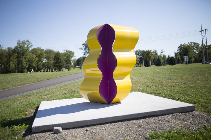 Description: The Vermont series brings the influence of the Green Mountain landscape to the bright colors and smooth shapes of Pop Art. This series was created between 1965-72 while artist Isaac Witkin (1936-2006) taught at Bennington College. He had never before experienced the changes across the four seasons so dramatically. Each piece is associated with one season, with Vermont II representing summer. Witkin saw the series as "a gradual unfolding of form as from a fist to an open hand." These were his first sculptures in steel, coinciding with a distinct change in his approach. He described this change as a desire to shape space rather than to shape form." Walking around Vermont II you experience this affect on space directly. You realize that the piece is not solid but rather more of a shell, the curved steel feeling almost delicate. The bright yellow outer sections indeed feel as though they are opening to reveal the bright pink section in the middle. Born in Johannesburg, South Africa, Witkin studied and began his career in London, coming to the US in 1965 to teach at Bennington. He was a resident at Sculpture Space in Utica in 1977. Witkin's work is in major collections all over the world: indeed, Vermont I is owned by the Tate Gallery, London; Vermont III is in the British Arts Council collection; and Vermont IV is privately held in Switzerland.