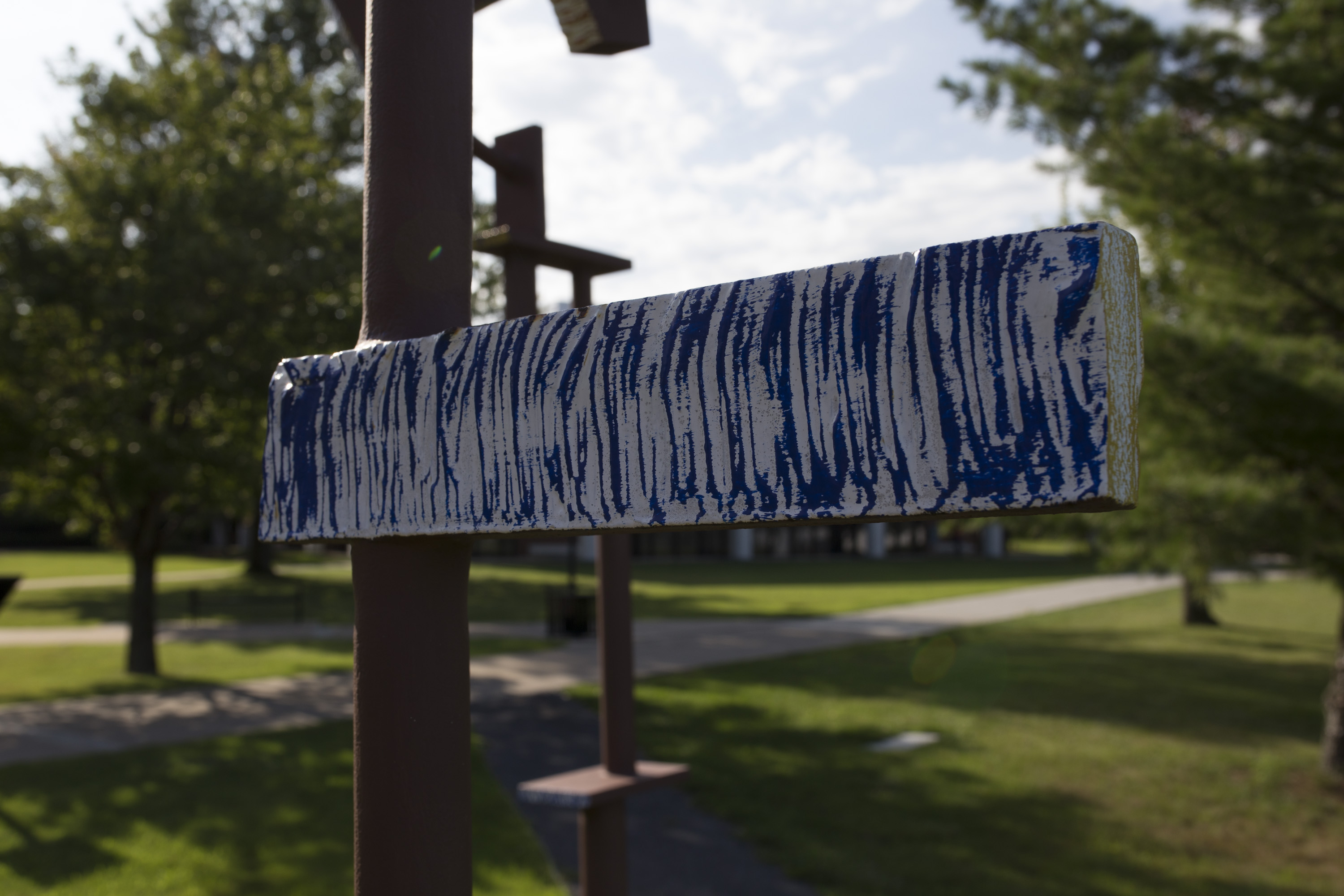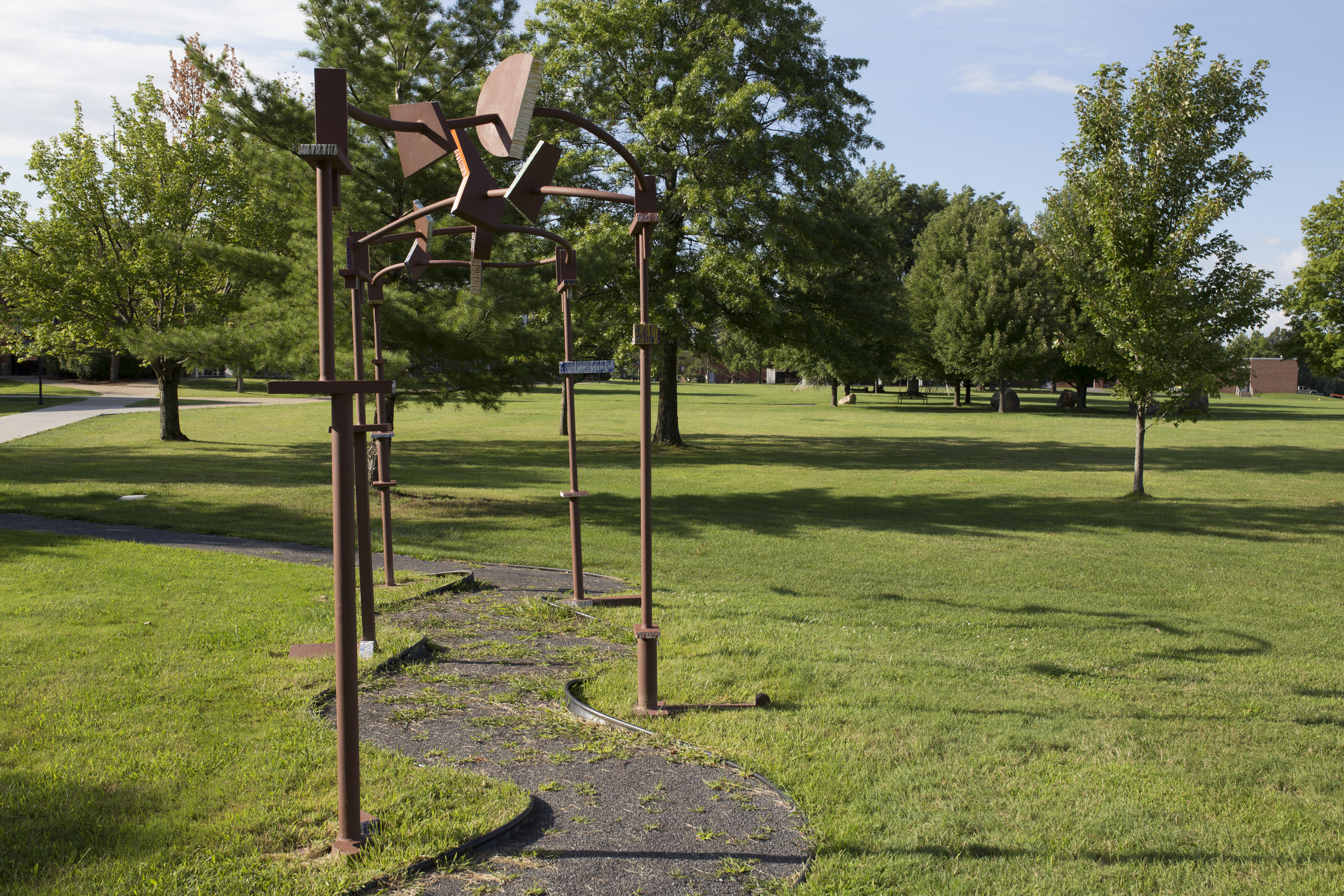 Description: Passage frames a contemplative pathway for students walking across the Utica College campus. Sculptor Mark Abildgaard designed it for interaction. As you pass under the sculpture it draws attention to itself, and the environment around it, from different perspectives. Abildgaard's inspiration came when he was traveling along I-80 to his residency at Sculpture Space in 1985. Driving from California to New York, he experienced the contours of the North American continent from West to East. He created this work during his residency, and at first loaned it to Utica College. He later donated it permanently. The sculpture stands near the Tree of Peace, planted in 1988 by Haudenosaunee Chief Jake Swamp. The tree and the sculpture together create a space inductive to reflection on the passages of life and the passing of time. A re-dedication ceremony in 2013 celebrated 25 years since the Tree of Peace had been planted and honored the passing of Chief Swamp.