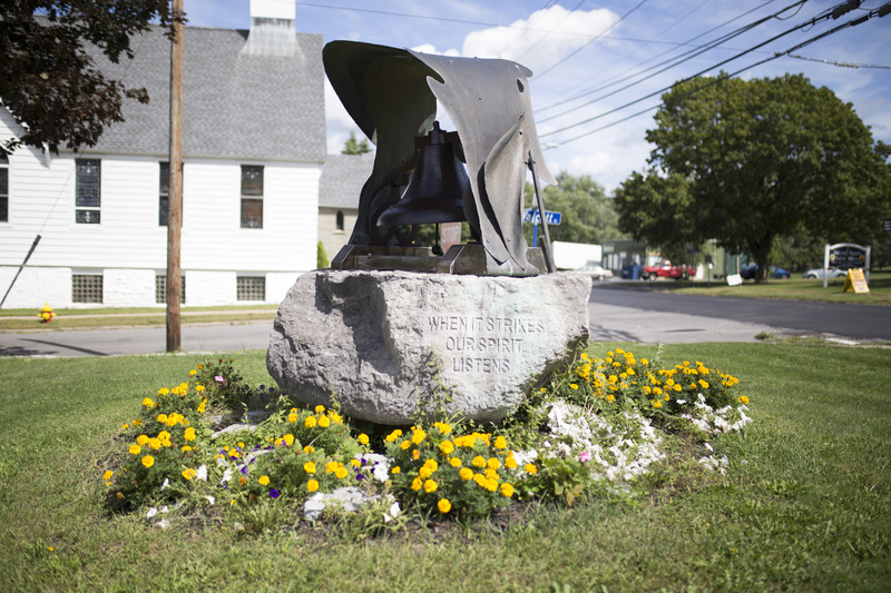Description: Wings of copper hover above the bell, providing a canopy to protect it as the New York Mills community has protected its family members and co-workers over the years. The bell is placed on a rock in the shape of a ship, representing the pilgrimage of Polish immigrants seeking a better life in the US. The bell once told textile workers when it was 6am: time to head to work. It tolled again when their lunch break began and ended, when the work day was done, and for a 9pm curfew. The bell was in a tower in the Number 2 Mill until the mills closed down. From 1952-1993, it was installed in the steeple of the Sacred Heart of Jesus Polish National Catholic Church. Reverend Walter Madej, pastor there since 1997 and a talented sculptor, had an idea: to incorporate the bell into a monument to the town's history of respect for work and family. Madej collaborated with fellow artist James McDermid to create a sculpture surrounding the bell. The rock base was donated from a quarry only 20 miles away and moved by a resident's trucking company. Rocks at the base came from the foundation of the original mill, and Gauthier Fabricating in Utica provided space to forge the copper wings.Since the unveiling on July 8, 2000, the second Saturday in July is celebrated as the community's annual Bell Festival.
