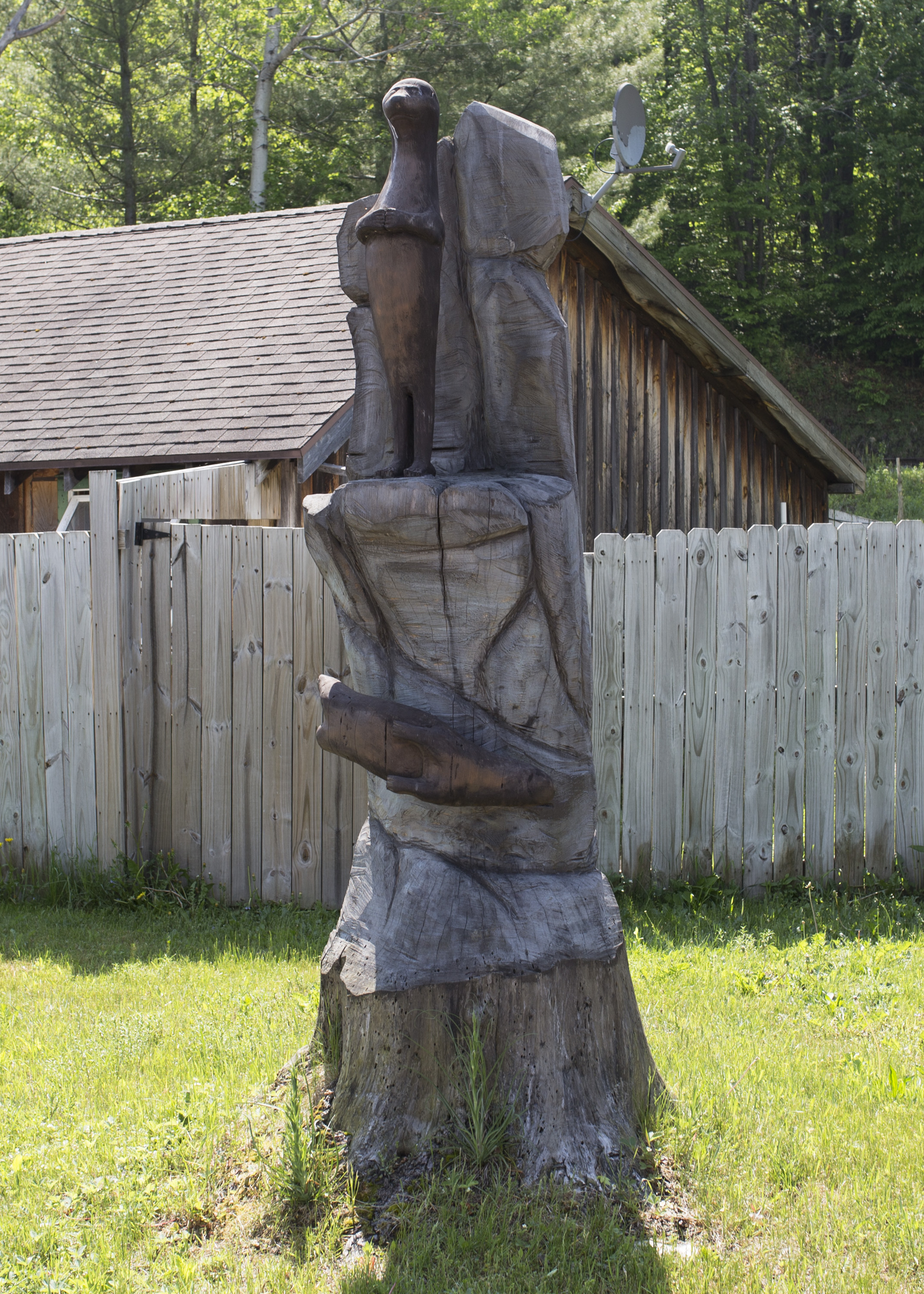 Description: Ellen Drake, the owner of Otter Lake Station, approached Ryan Abrial for help with a tree stump in the yard outside the bar. She didn't want to get rid of it: knowing him as a local artist, she hoped he could turn it into something more interesting. He was happy to oblige. The resulting wood carving depicts one adorable otter standing on top, looking out at all who pass by, a delightful mascot for the areas around Otter Lake. Below him is the tree trunk, still firmly rooted to the ground, but now transformed into a waterscape with another otter swimming below. Abrial typically uses aluminum cans as his medium of choice, and some of his work had been displayed in the bar. He had done some small relief carvings in wood, but he had always wanted to give wood carving a try on a larger scale. Abrial and Drake worked together on ideas for what the carving should depict, and he set to work in the winter of 2010. Abrial carved an hour here, an hour there, while also working as a carpenter. It took him two - three months to finish the work. He alternated between a chainsaw, chisel, hand grinder, and sander, also incorporating some color staining and wood burning for a greater sense of depth.