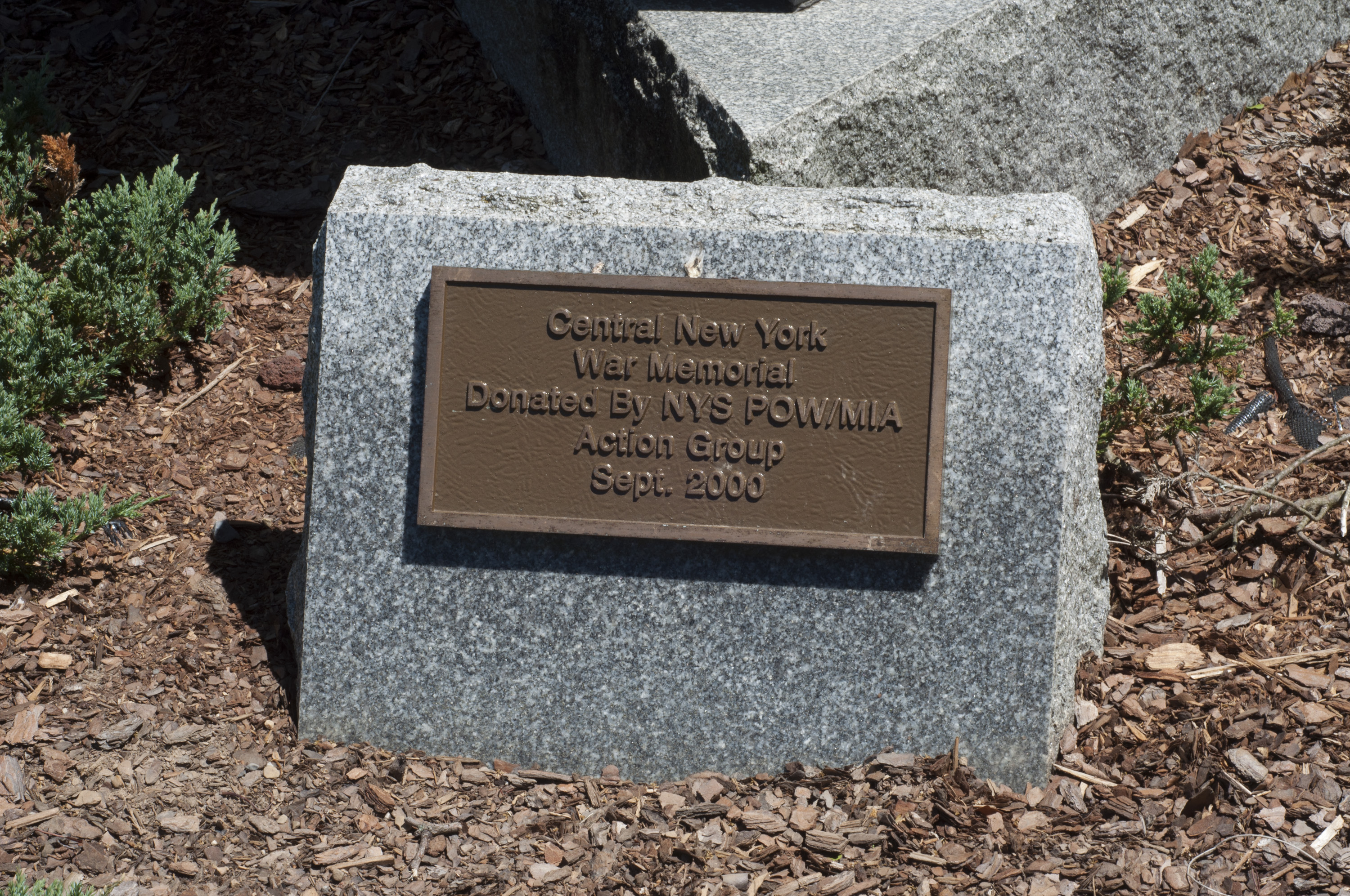 Inscription: "IN HONOR AND REMEMBRANCE OF THOSE MEN / AND WOMEN WHO SERVED AND FOUGHT DURING / WORLD WAR I / 'I CONGRATULATE YOU UPON THE SPLENDID FRUITS OF VICTORY WHICH YOUR HEROISM AND THE BLOOD OF OUR GALLANT DEAD ARE NOW PRESENTING TO OUR NATION, YOUR DEEDS WILL LIVE FOREVER ON THE MOST GLORIOUS PAGES OF AMERICAN HISTORY.' / GENERAL JOHN JAY PERSHING"; "IN HONOR AND REMEMBRANCE OF THOSE MEN / AND WOMEN WHO SERVED AND FOUGHT DURING / WORLD WAR II / 'WARS MAY BE FOUGHT WITH WEAPONS, BUT / THEY ARE WON BY MEN. IT IS THE SPIRIT OF / MEN WHO FOLLOW AND OF THE MAN WHO / LEADS THAT GAINS THE VICTORY.' / GENERAL GEORGE S. PATTON"; "IN HONOR AND REMEMBRANCE OF THOSE MEN / AND WOMEN WHO SERVED AND FOUGHT DURING THE / KOREAN WAR / 'WE MUST FIGHT TO THE END. WE MUST / FIGHT AS A TEAM. IF SOME OF US DIE, WE WILL / DIE FIGHTING TOGETHER.' / GENERAL WALTON H. WALKER / DEDICATED BY N.Y.S. POW/MIA ACTION GROUP / 2000"; "Central New York / War Memorial / Donated by NYS POW/MIA / Action Group / Sept. 2000" on side plaque