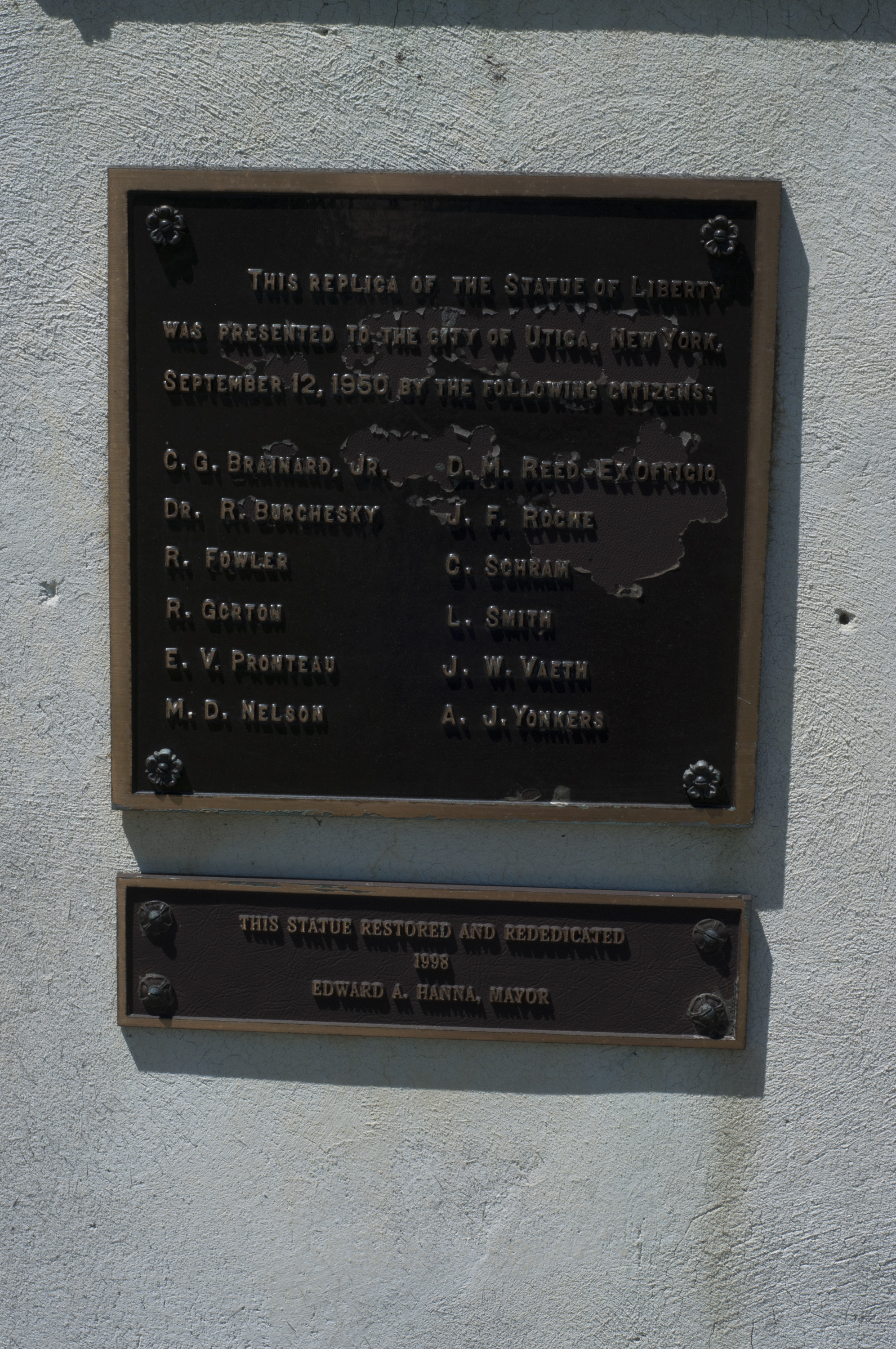 Inscription: “WITH THE FAITH AND COURAGE OF / THEIR FOREFATHERS WHO MADE / POSSIBLE THE FREEDOM OF THESE / UNITED STATES / THE BOY SCOUTS OF AMERICA / DEDICATE THIS COPY OF THE / STATUE OF LIBERTY AS A PLEDGE / OF EVERLASTING FIDELITY AND / LOYALTY / 40TH ANNIVERSARY CRUSADE TO / STRENGTHEN THE ARM OF LIBERTY / 1950” ; “THIS REPLICA OF THE STATUE OF LIBERTY / WAS PRESENTED TO THE CITY OF UTICA, NEW YORK / SEPTEMBER 12, 1960 BY THE FOLLOWING CITIZENS / C.G. BRAINARD, JR. D.M. REED-EX OFFICIO / DR. R. BURCHESKY J.F. ROCHE / R. FOWLER C. SCHRAM / R. GORTON L. SMITH / E.V. PRONTEAU J.W. VAETH / M.D. NELSON A.J. YONKERS"; “THIS STATUE RESTORED AND REDEDICATED / 1998 / EDWARD A. HANNA, MAYOR”