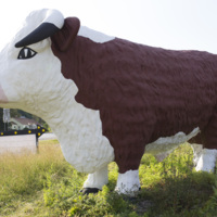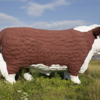 This fiberglass bull has been cast over and over for locations all over the country. It was especially popular as a mascot called "Sir Loin" for a chain called "Sirloin Stockade." Started in Oklahoma City in 1966, this chain went on to have 80 locations in 8 states. Lucky shares the fuzzy red coat and white markings of Sir Loin, modeled after Hereford cattle, but also has horns.