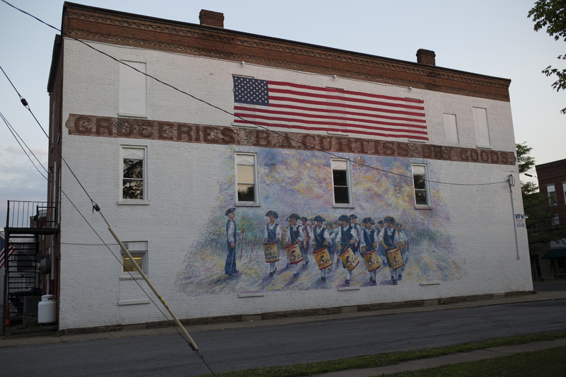 The Camden Continentals Fife and Drum Corps are memorialized in this 2014 mural by Jane Grace Taylor. Founded in 1850, the Corps actually began not in Camden, but in nearby Taberg. They were called upon to play at many patriotic events over the years, including the inauguration of President Ulysses S. Grant. Almost a century after their founding, in 1947, they moved and took on a new name: the Camden Continentals. This group is still thriving today, including some descendants of the original group. Funds for this mural were raised by the Camden VFW community to honor the role of the Corps in many local events.
