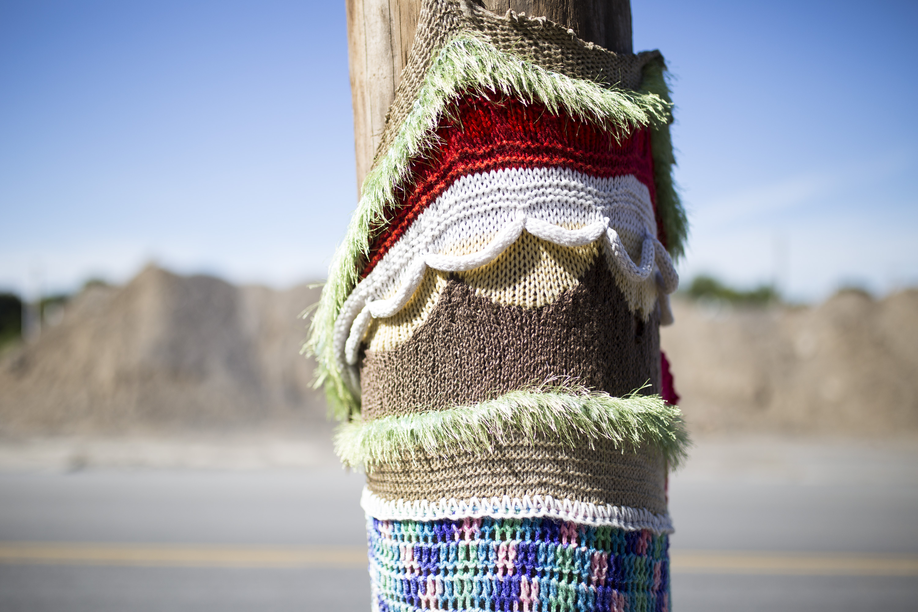 This art form juxtaposes brightly colored yarn and soft textures with the neutral solidity of utilitarian objects and architectural details. The term itself is even a juxtaposition, contrasting soft and comforting yarn with the violence of a bomb. It is borrowed from the graffiti artist's idea of "bombing," quickly covering large spaces in one area.