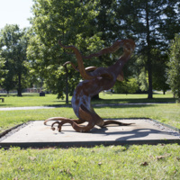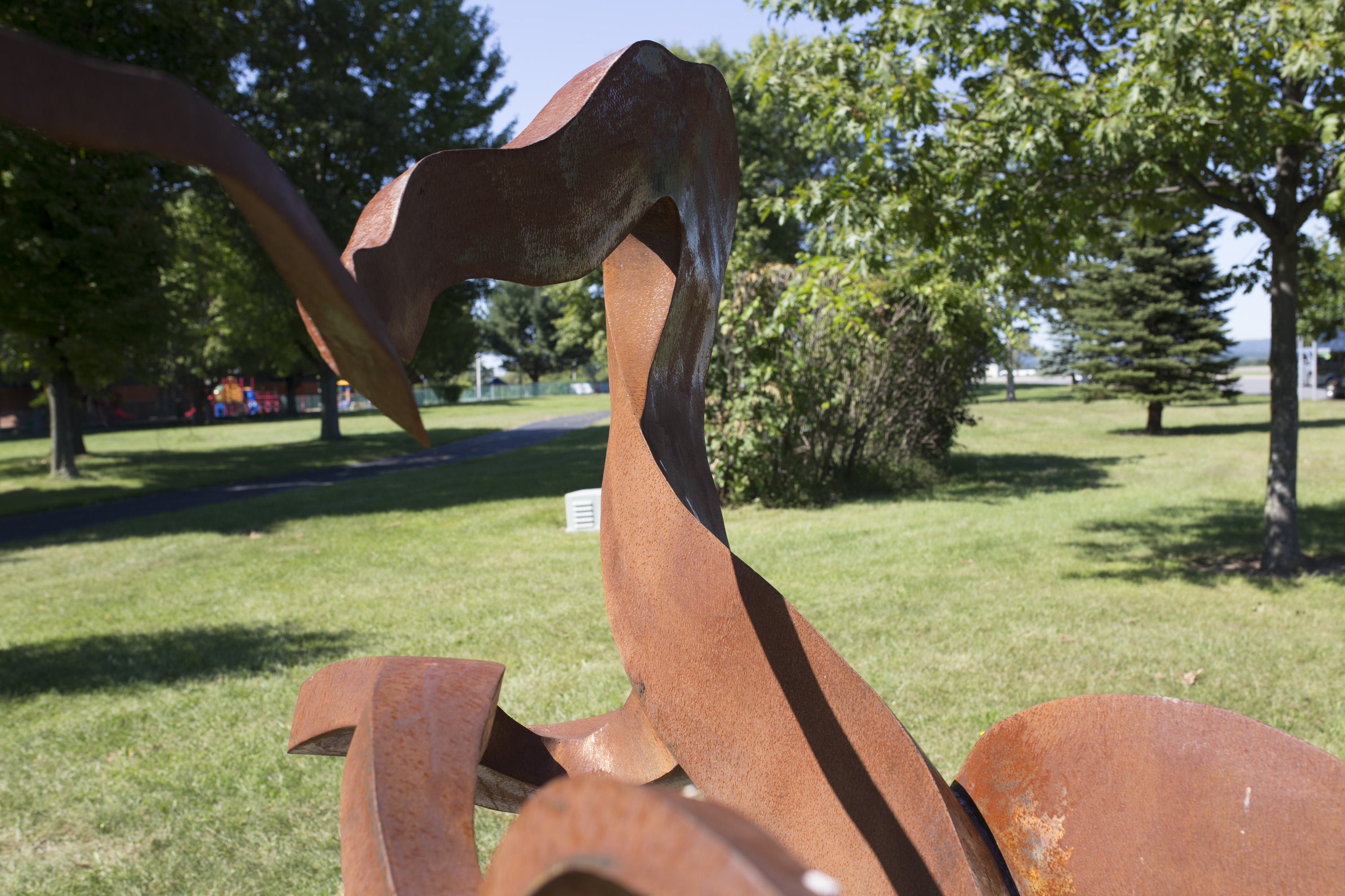 Description: Tendrils of steel emanate from the center like flames in Fire Dance by George Hendrickson. The flame shapes also take on a figurative nature, appearing to have arms and legs whirling in motion. This sculpture was installed at the Griffiss International Sculpture Garden in Rome in 2014.